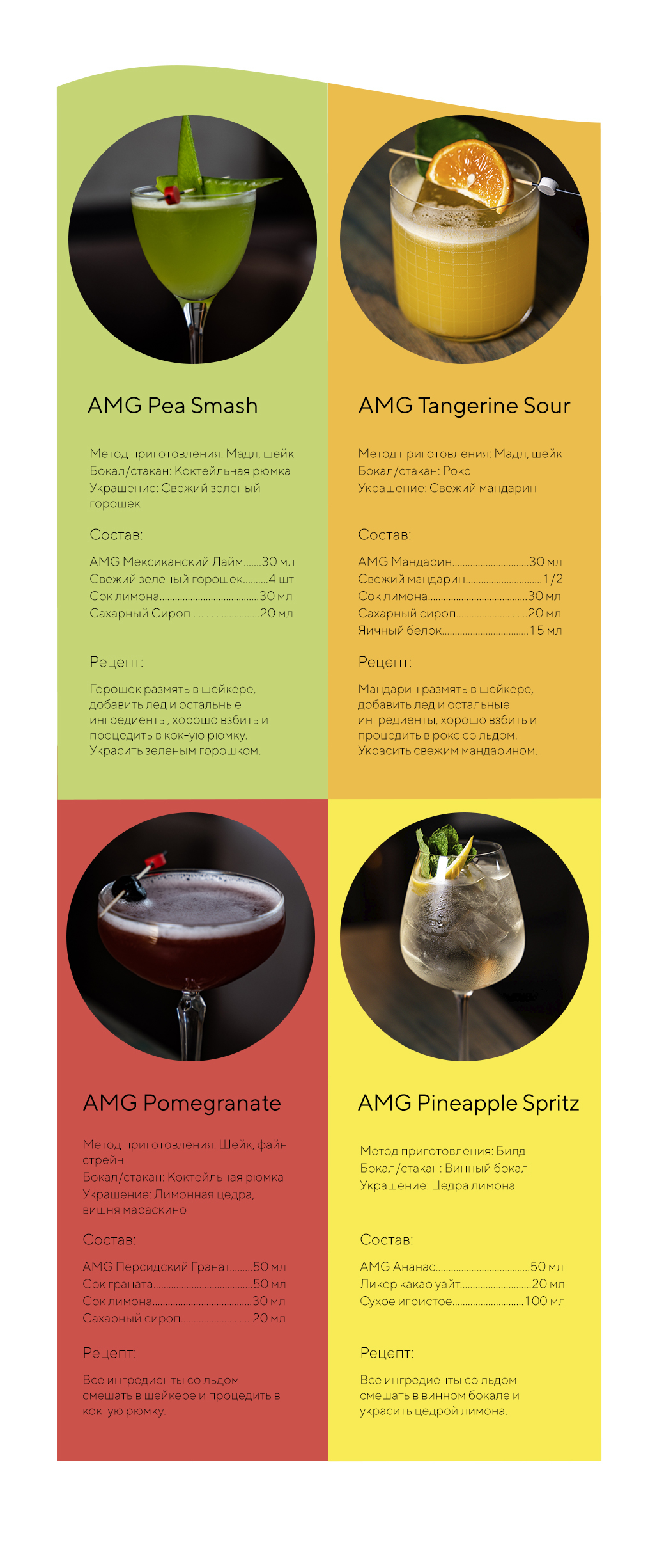 В состав настойки входят только натуральные ингредиенты — зерновой спирт и артезианская вода, а также настои аргентинских грейпфрутов и абхазских лимонов. AMG Грейпфрут с лимоном обладает насыщенным вкусом, в котором сочетаются свежие ноты цедры лимона и горчинка грейпфрута. Богатый вкус напитка гармонично раскрывается при подаче в охлажденном виде. Настойка придется по вкусу любителям яркой цитрусовой нотки в крепких напитках.